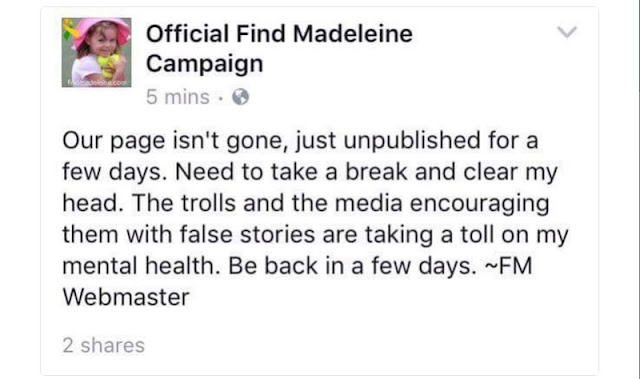 The media at the time (August 2014) quoted Madeleine’s father, Gerry McCann - who had been active in the ‘Hacked Off’ campaign which aimed to suppress freedom of the press - as saying that such internet trolls must be severely punished. He publicly called for prosecutions of trolls who ‘should be made an example of’.